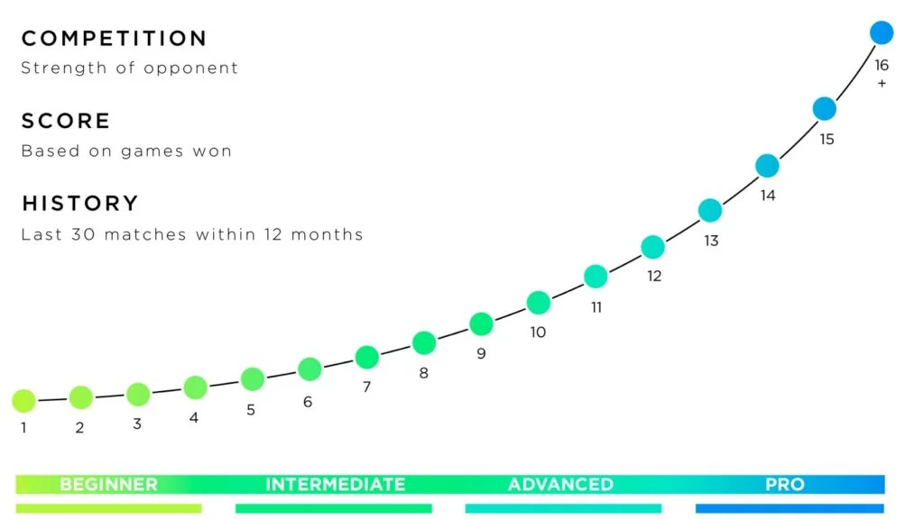 All players, regardless of age, gender, geography, or skill level, are rated on the same scale between 1.00 and 16.50 based on actual match results.